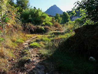 La opción más complicada es la que se sigue en esta ruta y se trata de, en llegar al primer camino de tierra que sale hacia la izquierda, con el Puig Campana al fondo, descender hasta unos bancales con olivos y seguir la ruta adentrándose por el barranco.