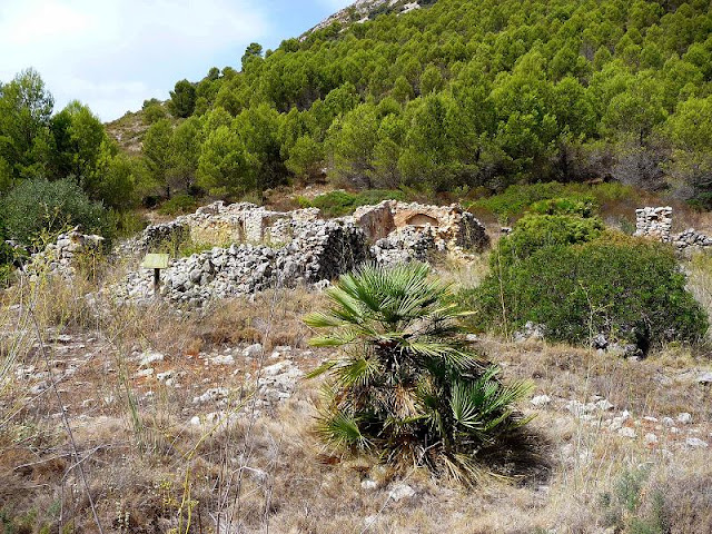 Se pasa junto a los restos de una antigua caseta agrícola y más delante se despeja el terreno y se llega al Barranc del Curt, por donde prosigue el sendero siguiendo el cauce.